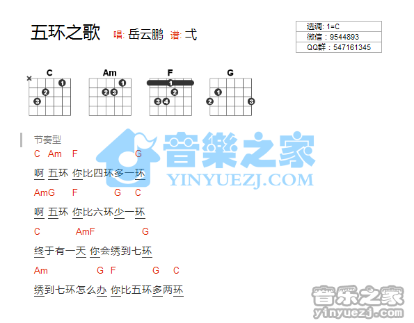 吉他岳云鹏《五环之歌》吉他谱_吉他弹唱谱_YYZJ编配