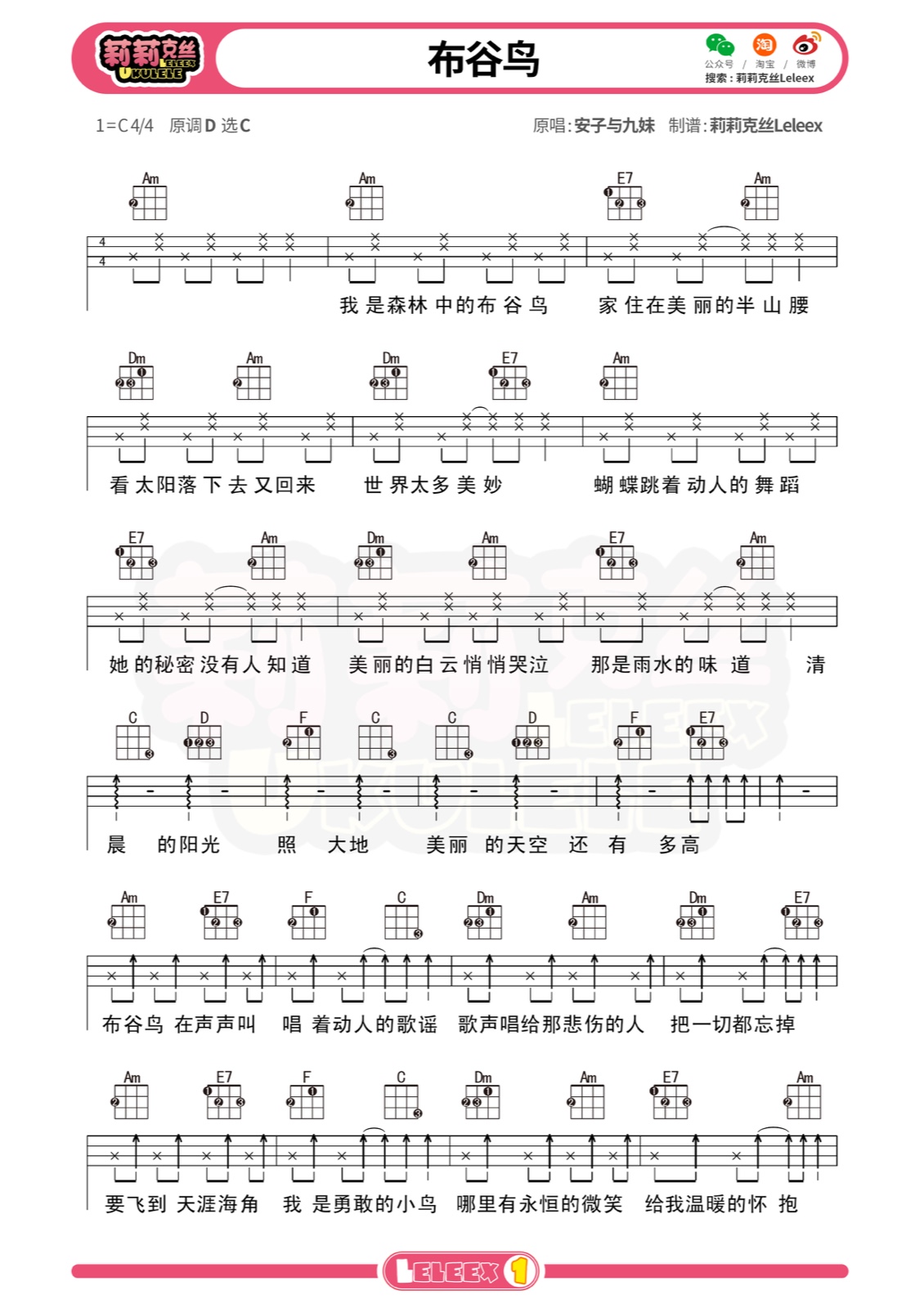 尤克里里安子与九妹《布谷鸟》尤克里里谱-C调弹唱谱