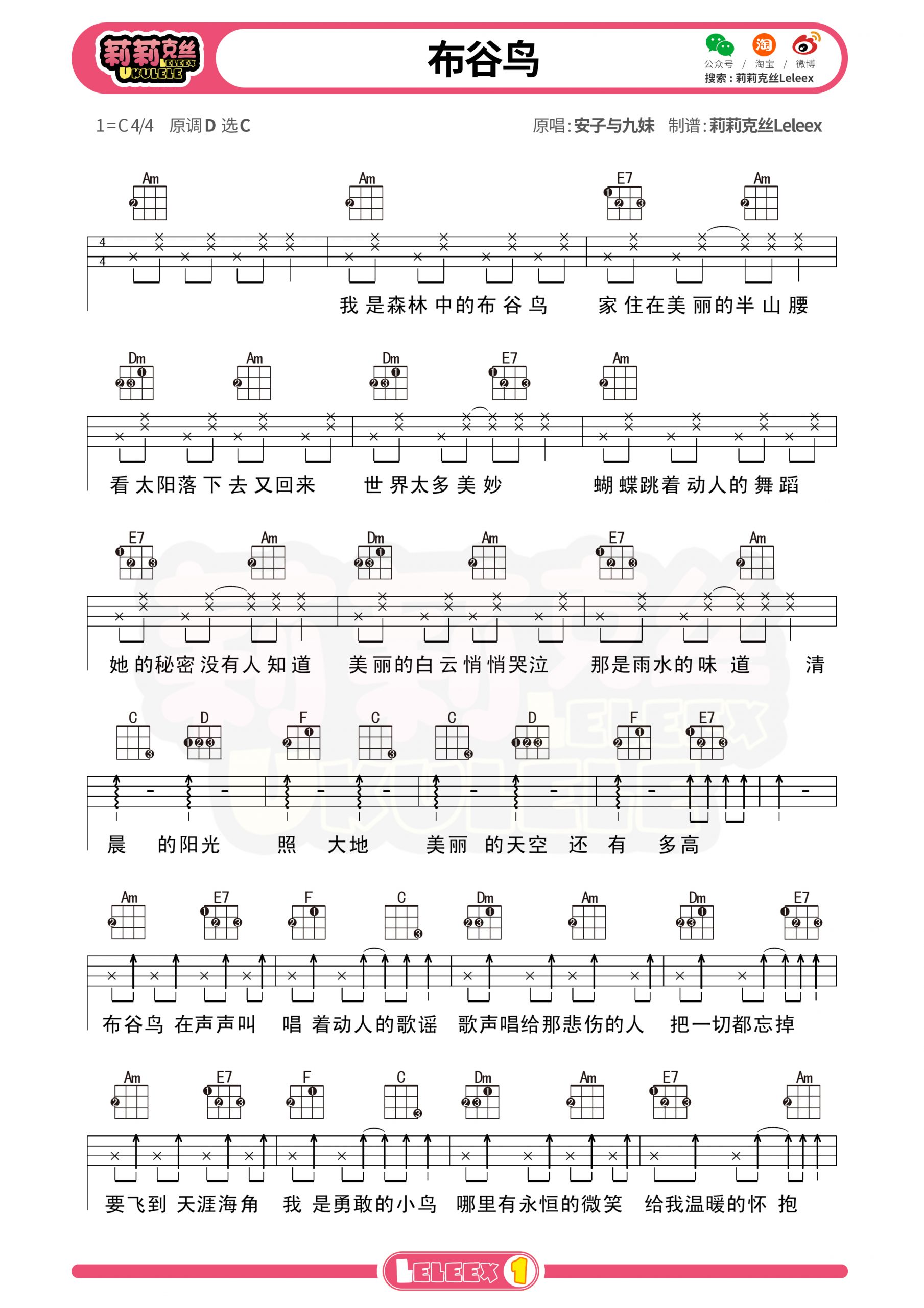 安子与九妹《布谷鸟》尤克里里谱-C调弹唱谱...