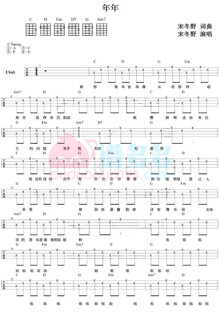 尤克里里宋冬野《年年》尤克里里-C调弹唱谱