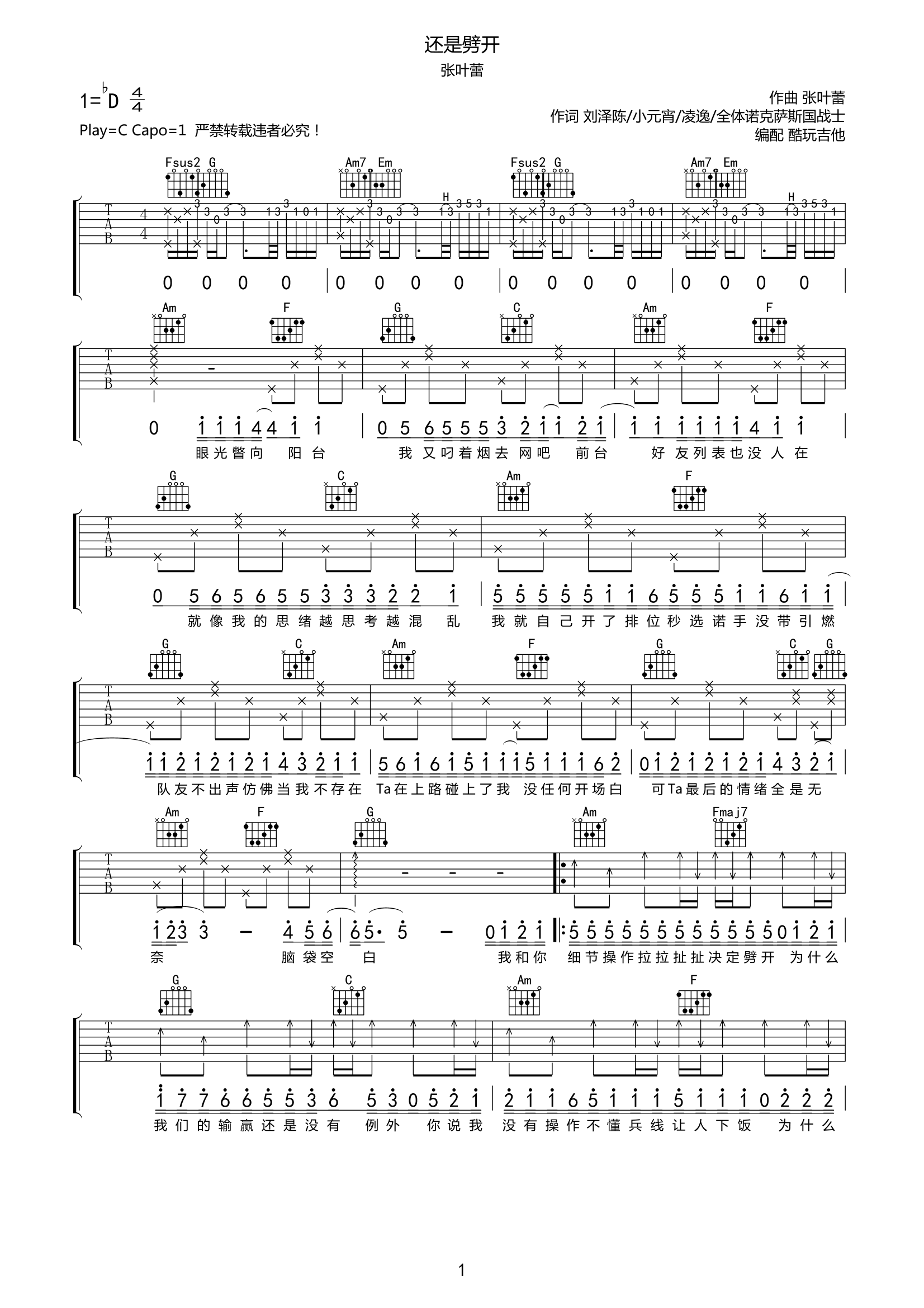 吉他张叶蕾《还是劈开》吉他谱-C调吉他谱高清