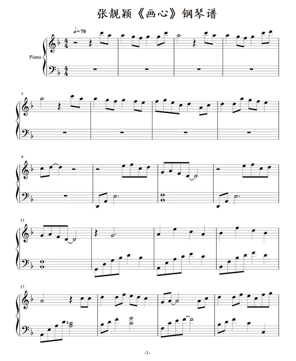 张靓颖《画心》钢琴谱,采用F调指法编配,共有5张高清图谱。...