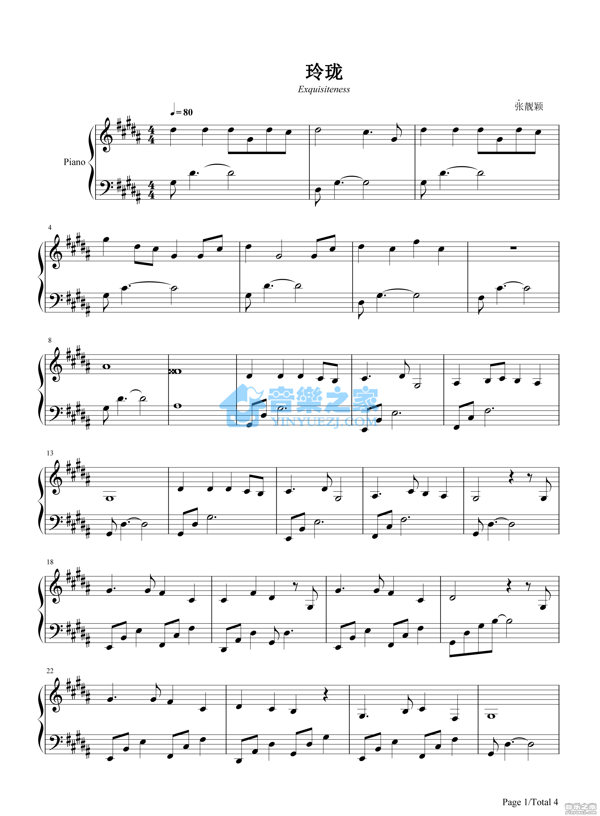 张靓颖《玲珑》钢琴五线谱...