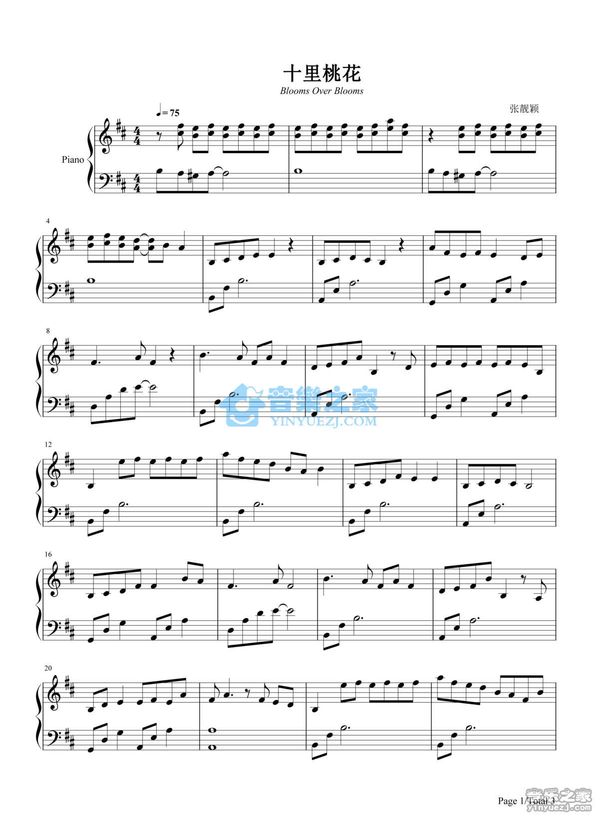 张靓颖《十里桃花》钢琴五线谱...