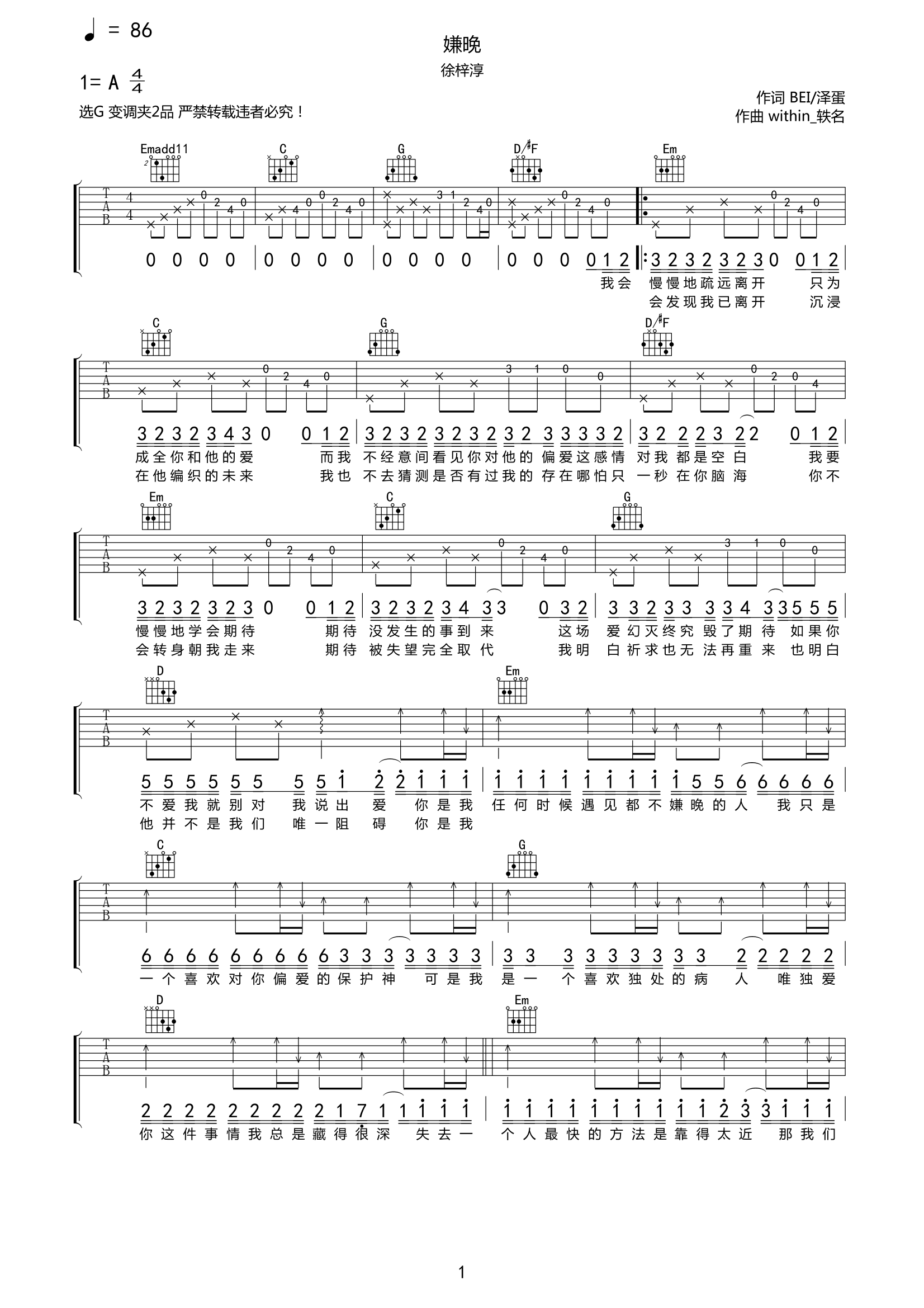 吉他徐梓淳《嫌晚》吉他谱_吉他弹唱谱