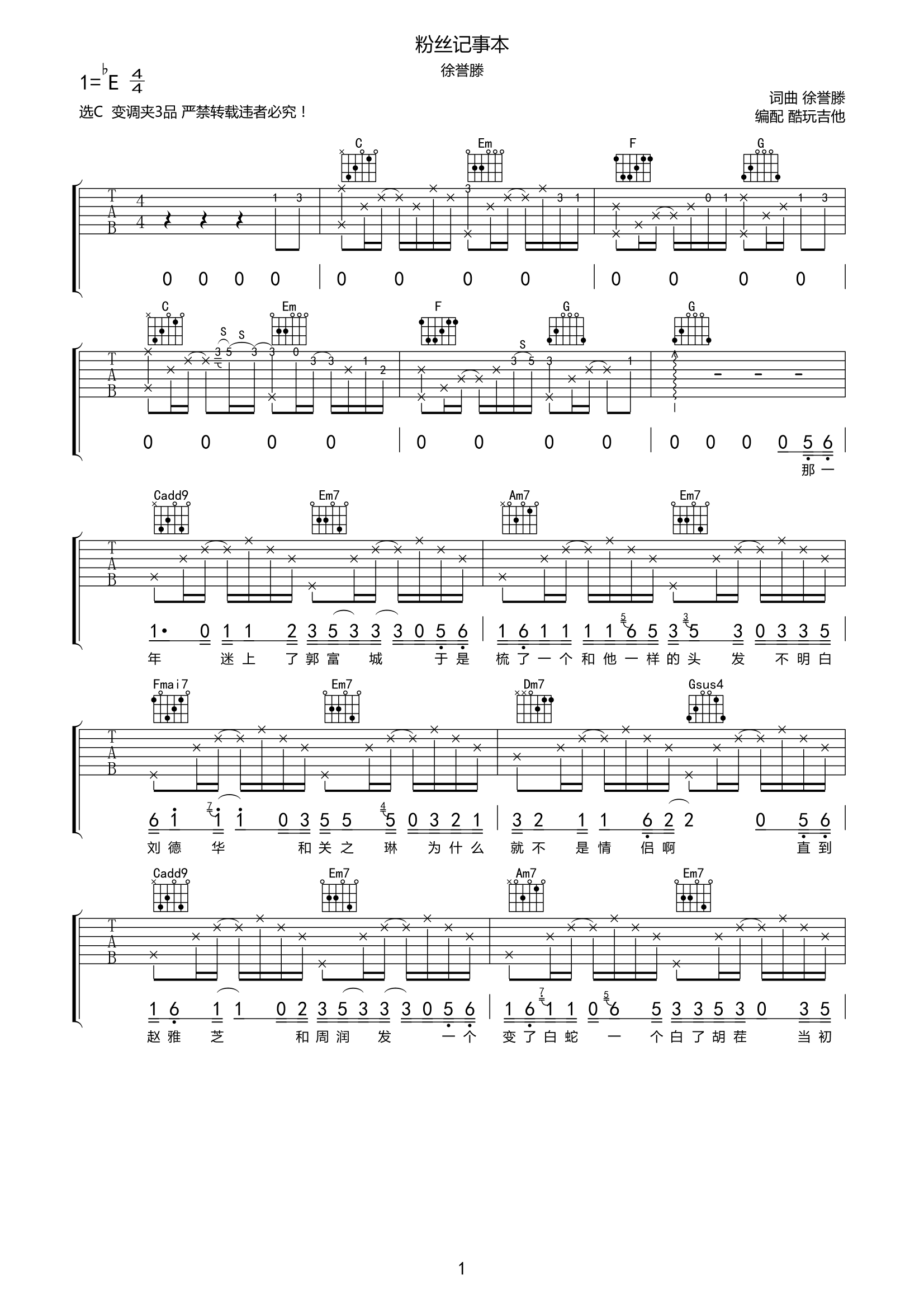 徐誉滕《粉丝记事本》吉他谱-C调六线谱弹唱谱附完整前奏间奏尾奏...
