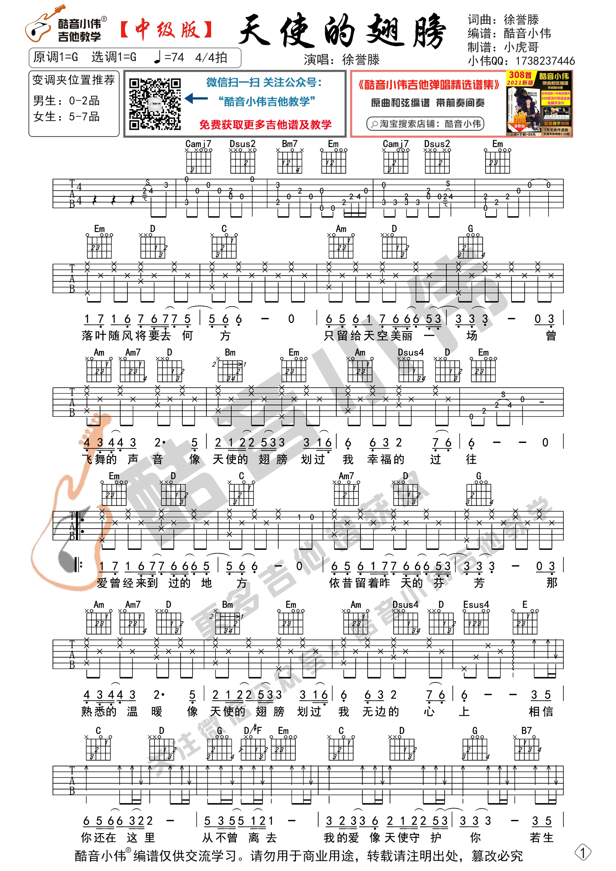 徐誉滕《天使的翅膀》吉他谱G调中级版原版...