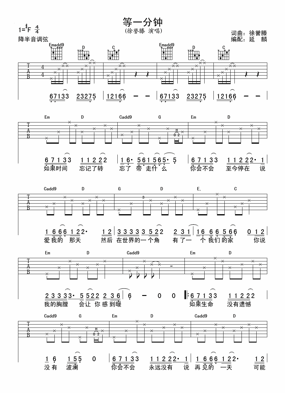 吉他徐誉滕《等一分钟》吉他谱_吉他弹唱谱_延麟编配
