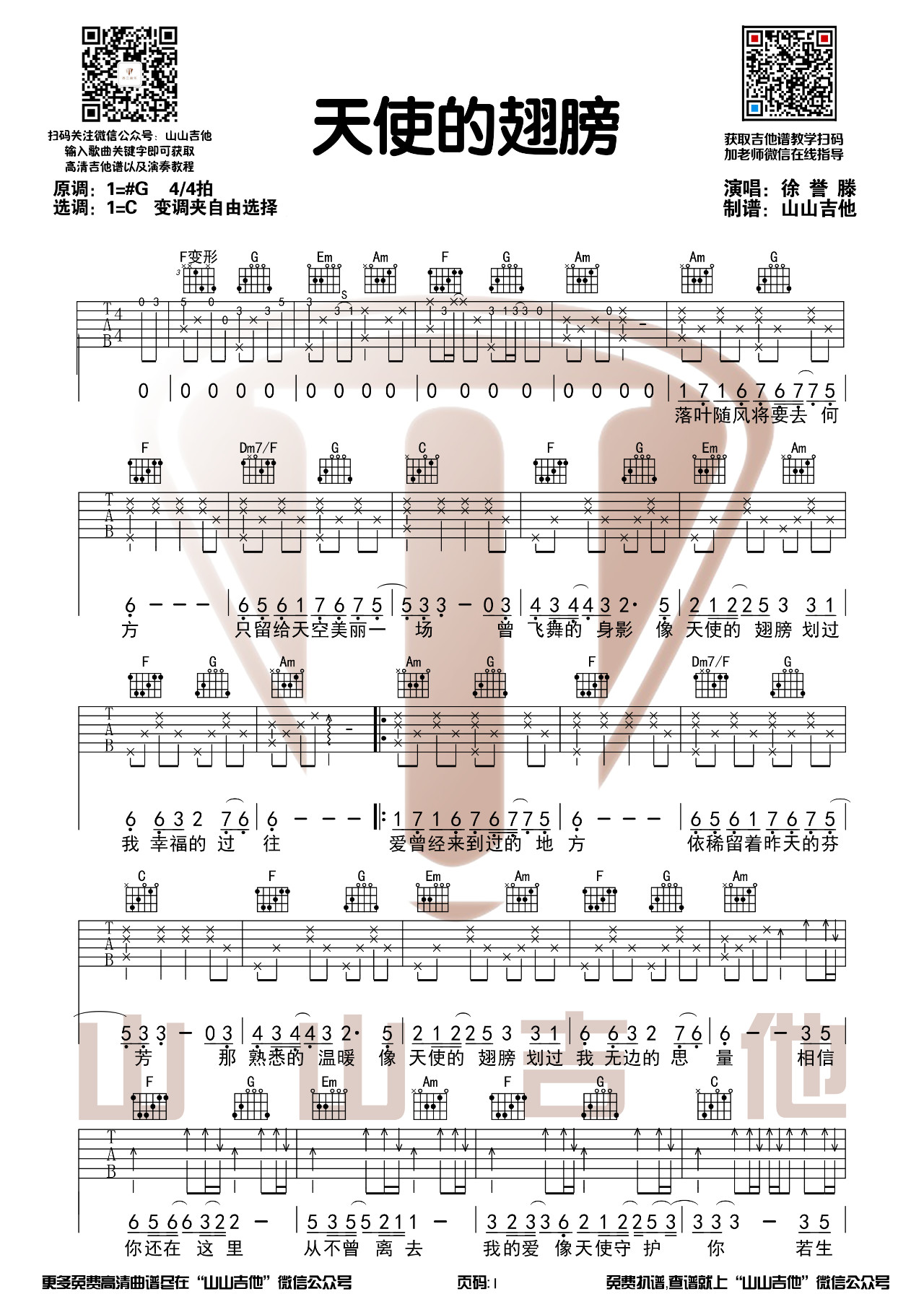 吉他徐誉滕《天使的翅膀》吉他谱_吉他弹唱谱_山山吉他编配