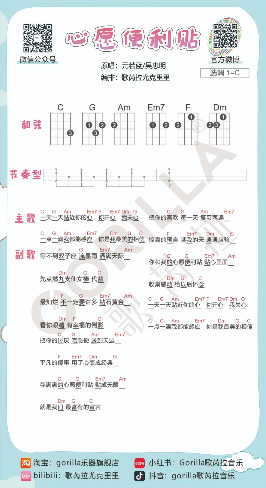 尤克里里元若蓝/吴忠明《心愿便利贴》尤克里里完整弹唱谱-C调弹唱谱