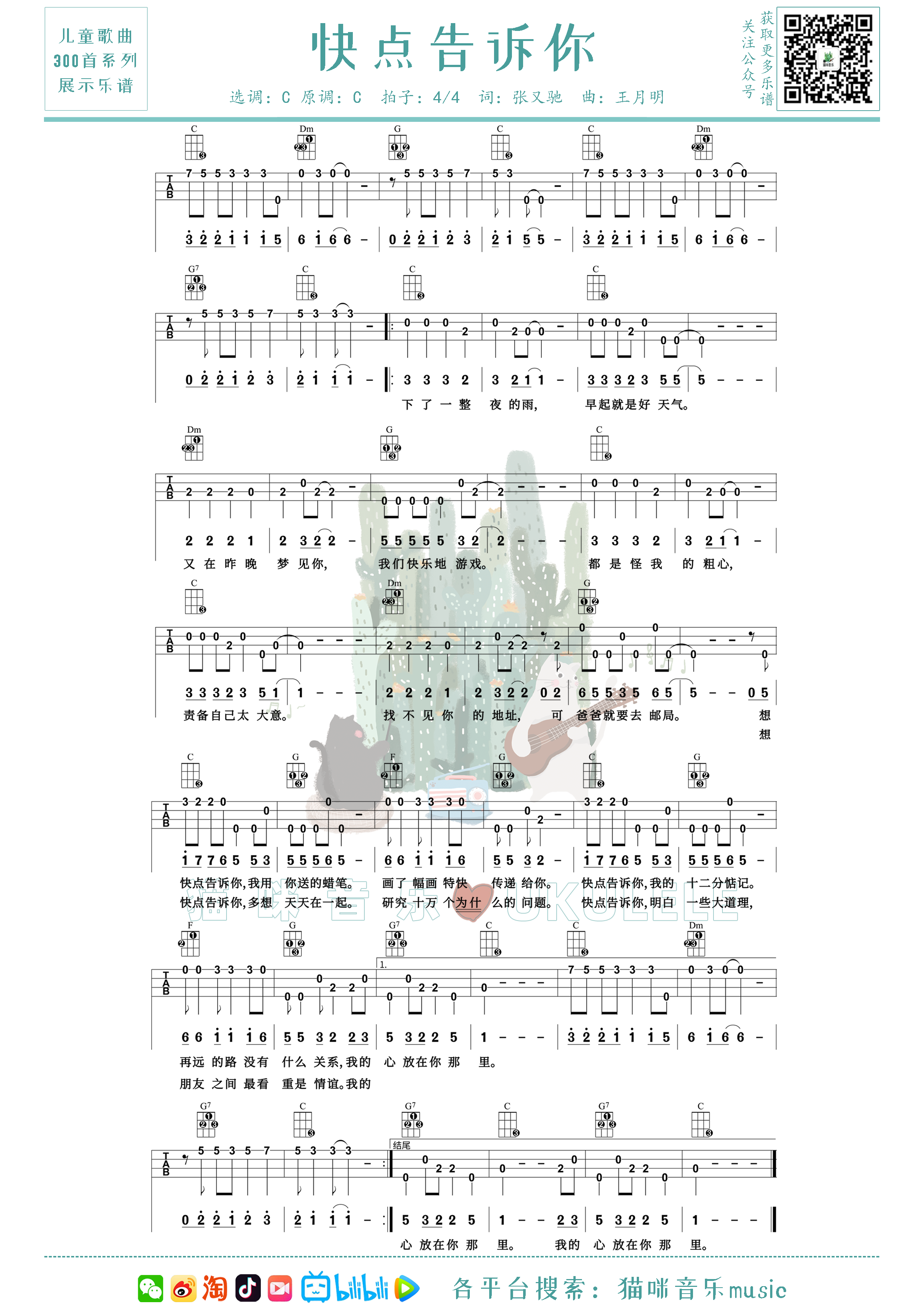 尤克里里《快点告诉你》尤克里里儿童歌曲300首系列,弹唱指弹双谱合一版。