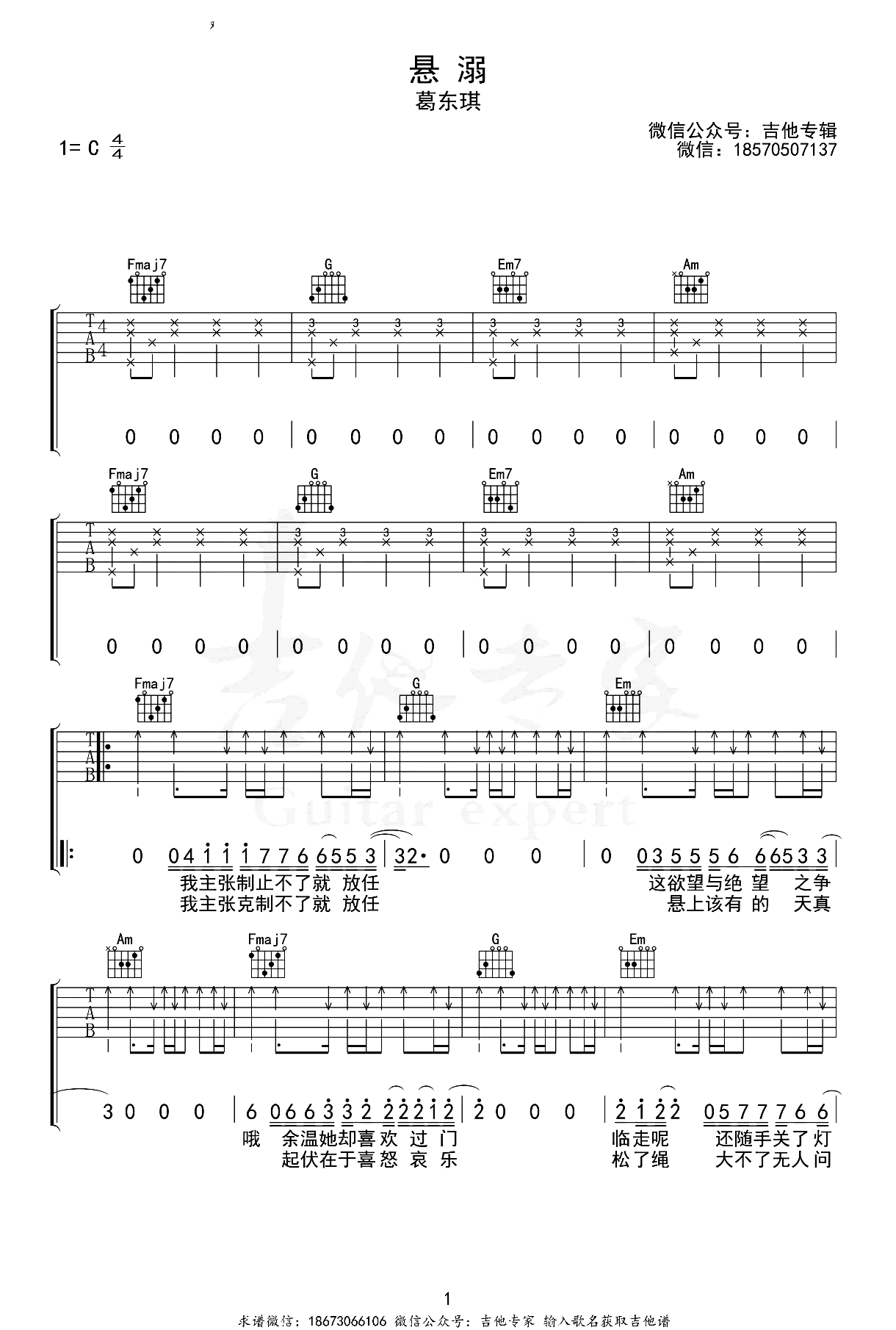 悬溺吉他谱,谱子选原调C和弦指法编配。葛东琪:悬溺吉他弹唱谱,曲谱一共1页图片六线谱。...