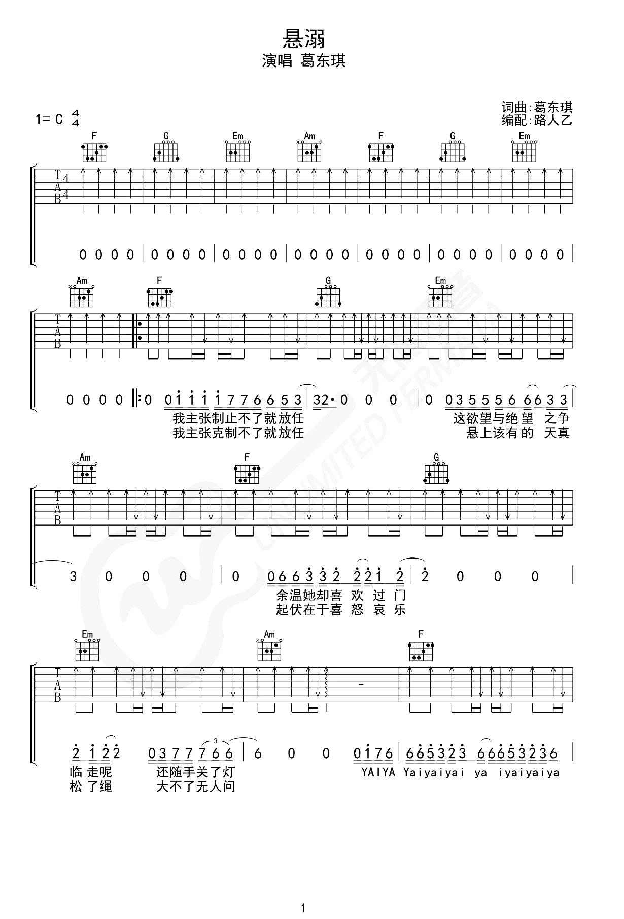 吉他悬溺吉他谱_葛东琪_C调六线谱
