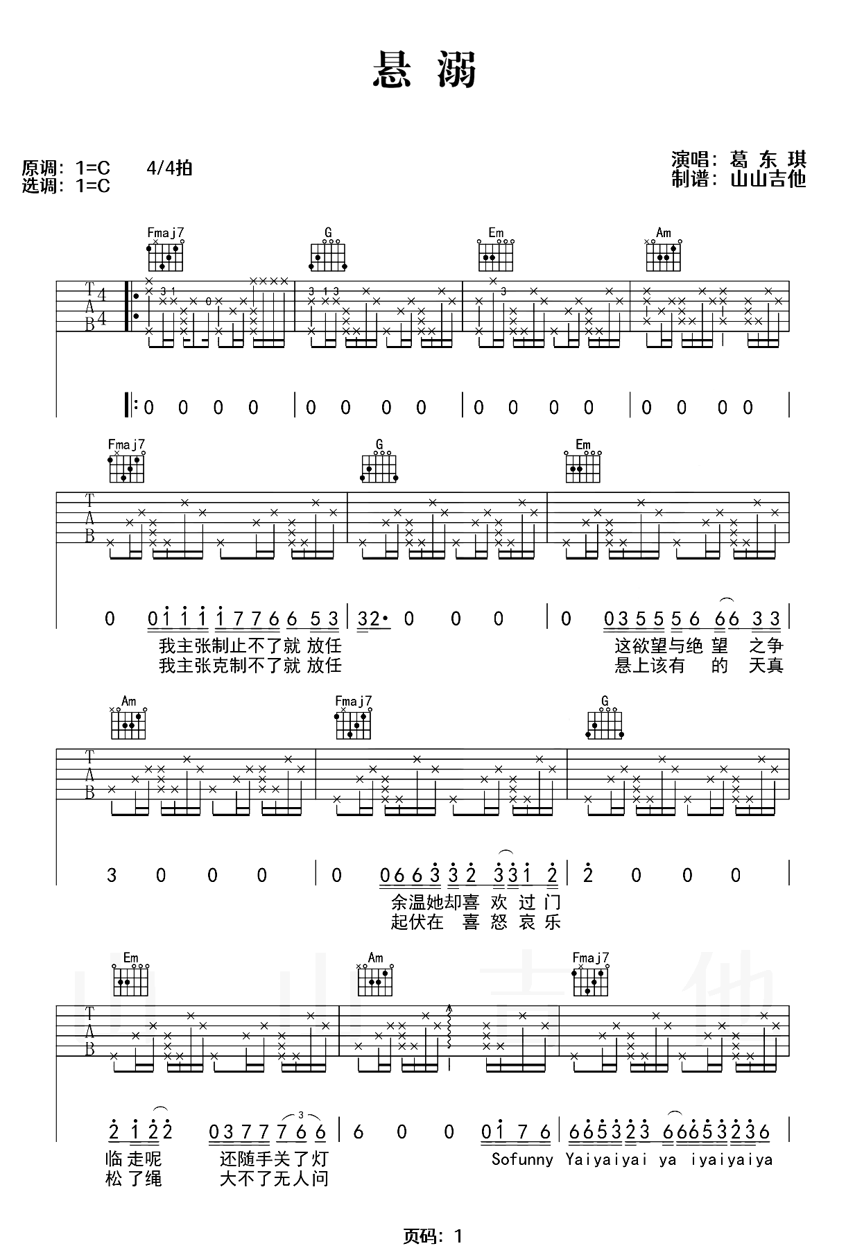 吉他葛东琪《悬溺》吉他谱_吉他弹唱谱_山山吉他编配