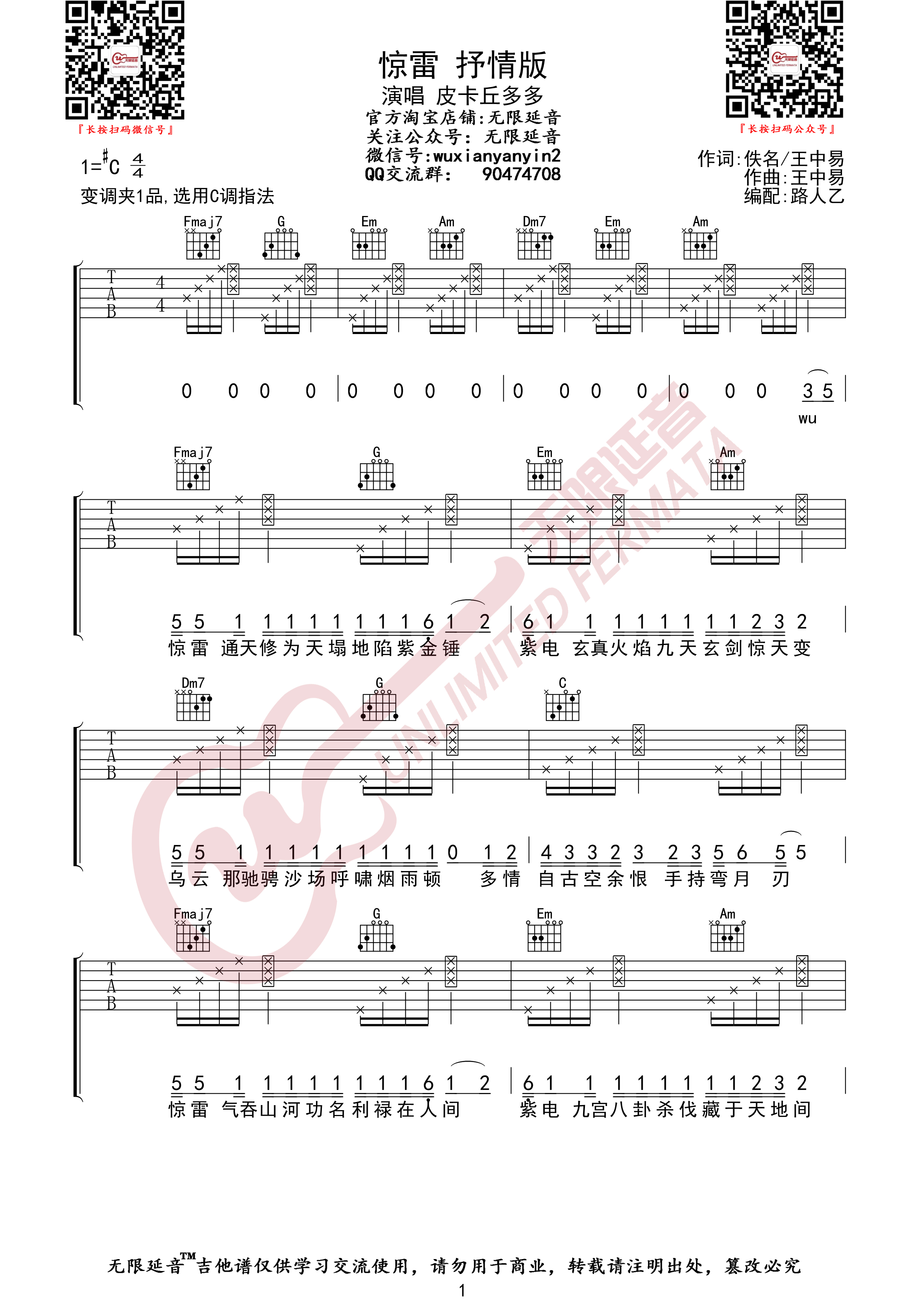 皮卡丘多多《惊雷》抒情版吉他谱无限延音编配...