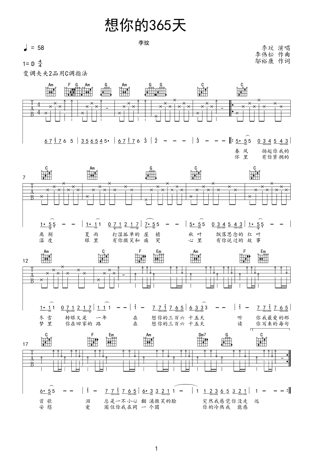 李玟《想你的365天》吉他谱,YYZJ编配出品,共有1张高清图谱,免翻页排版设计。...