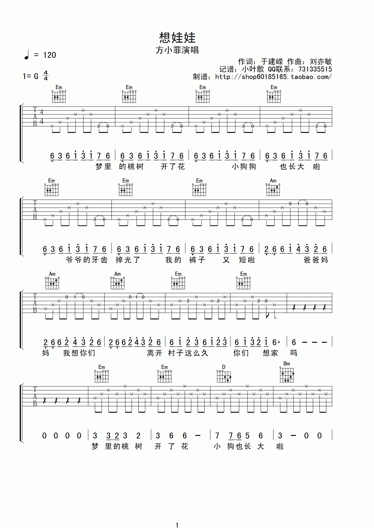 吉他方小菲《想娃娃》吉他谱_G调吉他弹唱谱