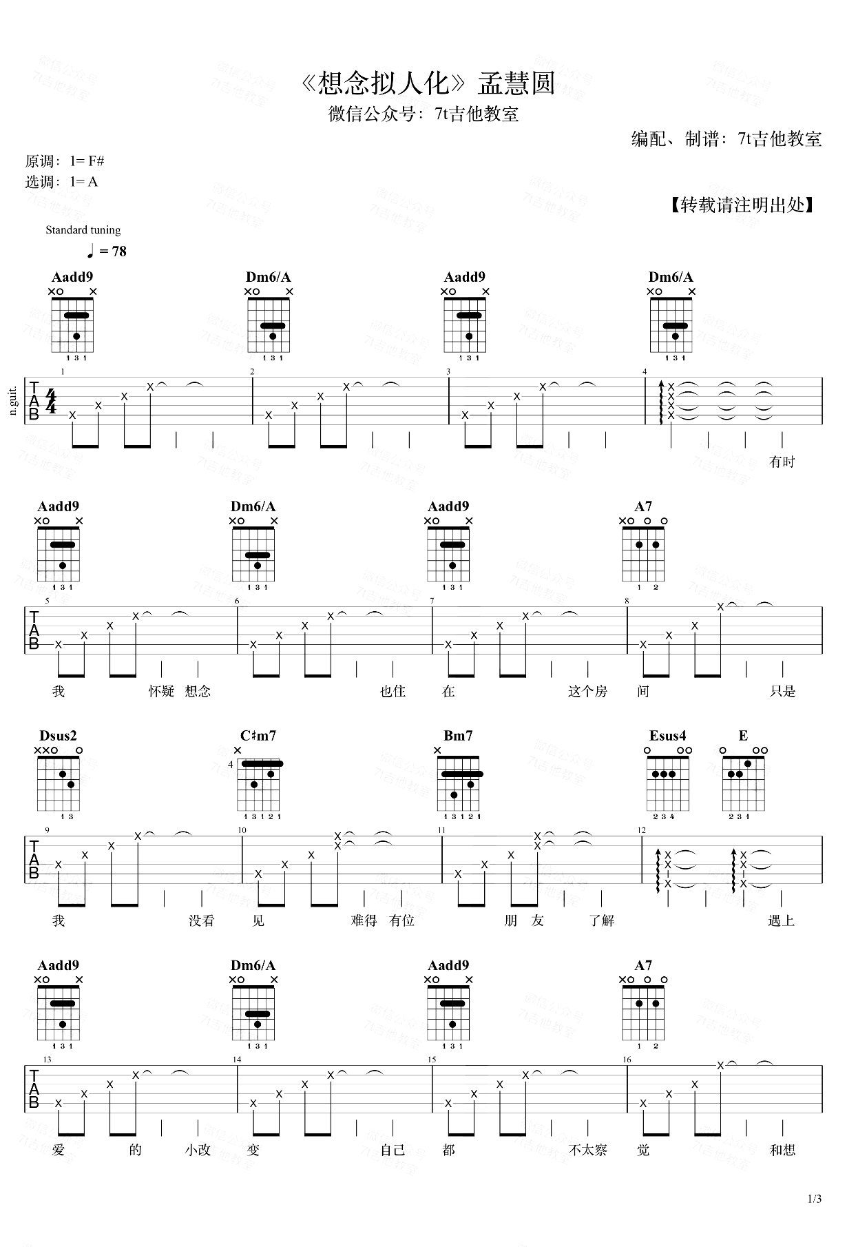 想念拟人化吉他谱_孟慧圆_A调弹唱谱标准音调弦,变调夹夹在第1品。想弹原调的朋友不适合用这个谱子哦……歌曲前奏和主歌多次用了四级小和弦Dm6/A,增加离调的味道,其中还加了6音,并且使用转位把A作为最低音,使得和声更丰富;主歌还用了副属和弦A7→Dsus2,流行歌里面副属和弦的运...
