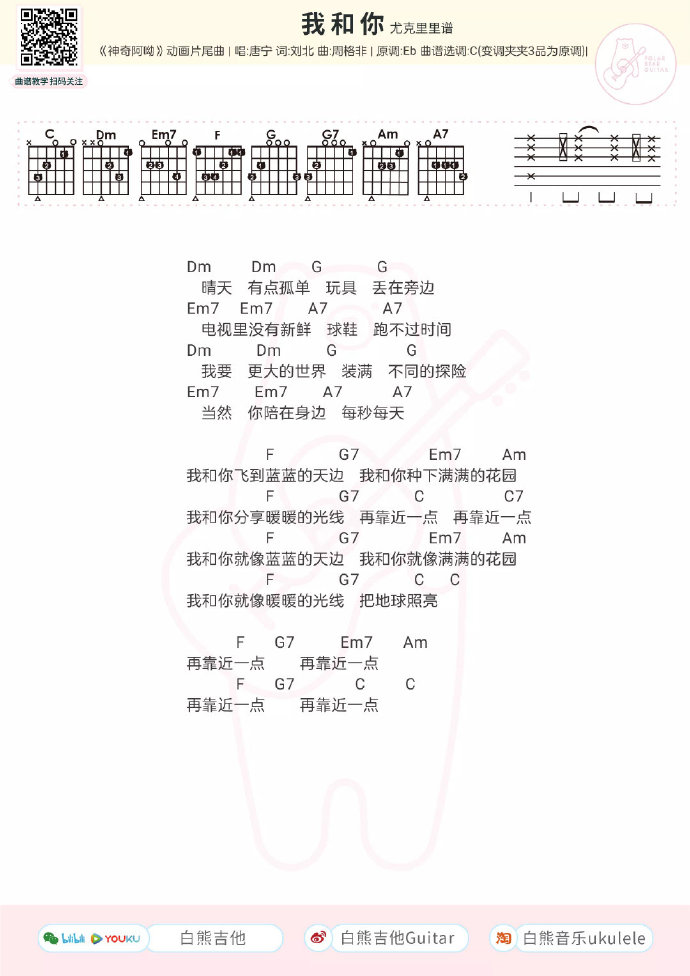 吉他皮卡丘多多《我和你》吉他谱 C调弹唱谱