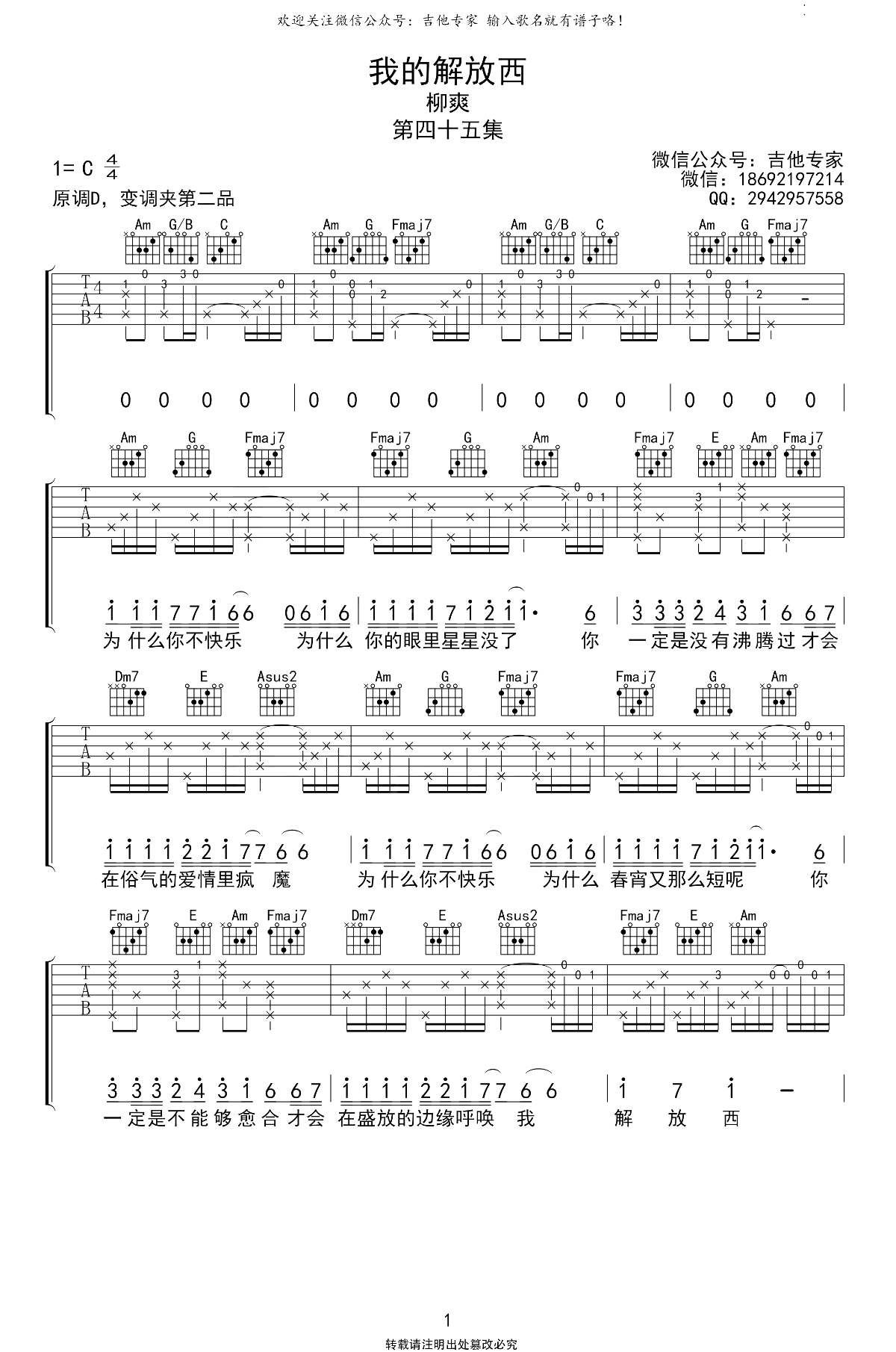 我的解放西吉他谱_柳爽_C调弹唱谱_原版六线谱《我的解放西》吉他弹唱谱,原调D,选用C调指法,变调夹夹第二品,三张图片六线谱。...