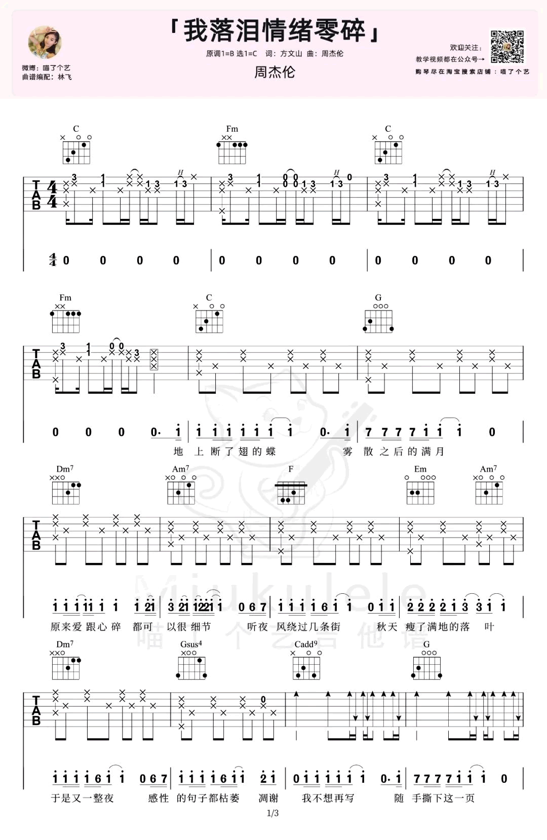 我落泪情绪零碎吉他谱_周杰伦_弹唱吉他六线谱选用C调和弦编配,共三张图片谱例。...