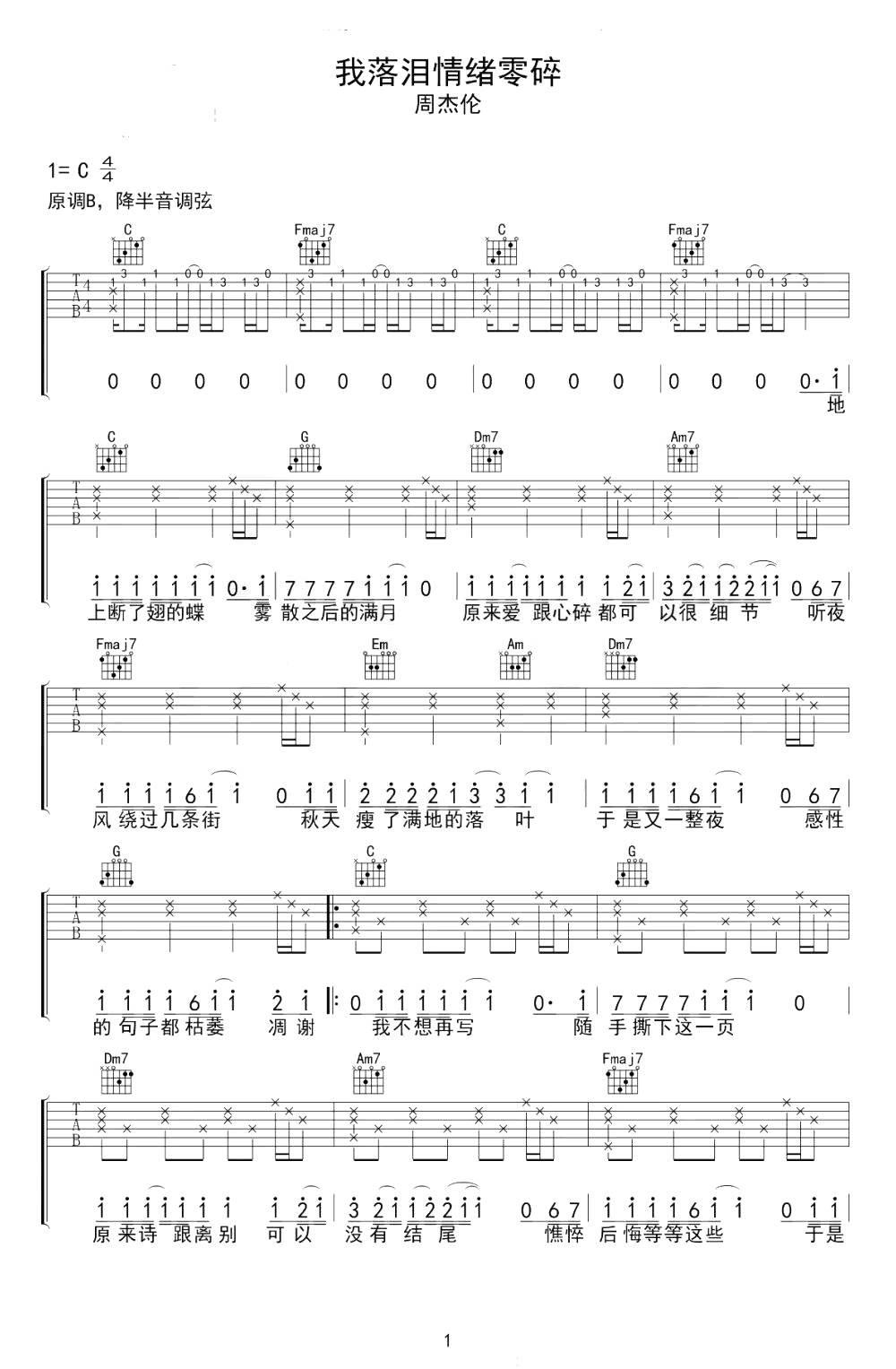 我落泪情绪零碎吉他谱_C调_周杰伦_弹唱六线谱...