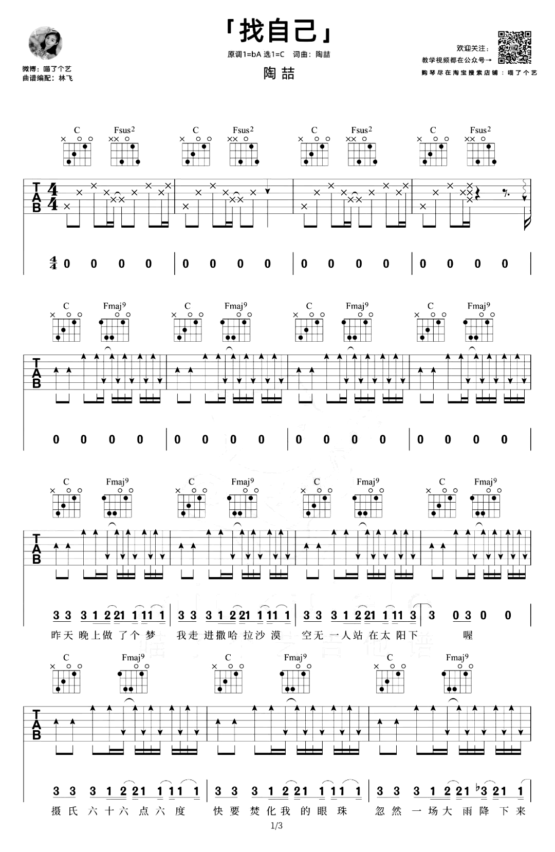 陶喆《找自己》吉他谱,孙学长吉他教室编配出品,共有3张高清图谱。...