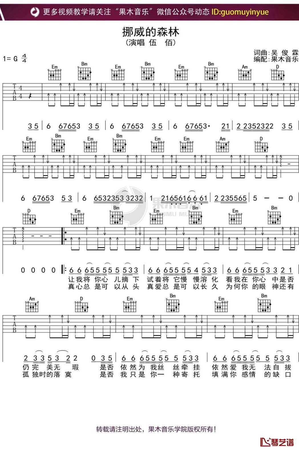 伍佰《挪威的森林》吉他谱-G调原版弹唱谱六线谱...