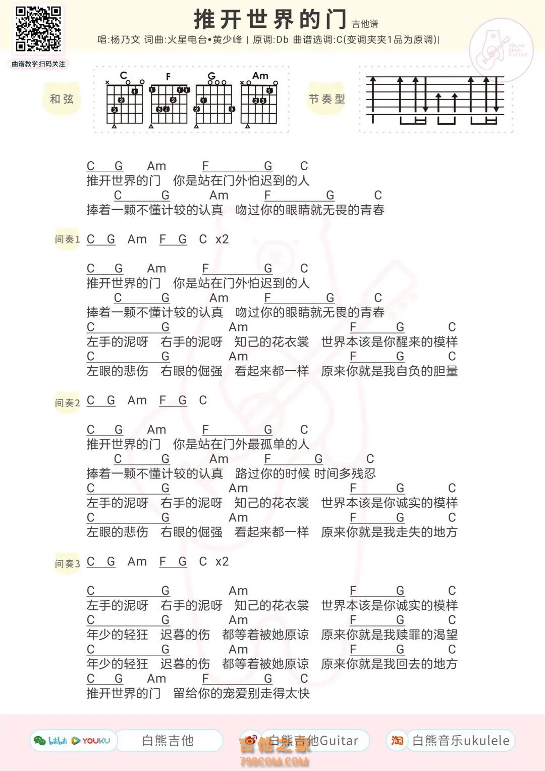 吉他杨乃文《推开世界的门》吉他谱_吉他弹唱谱_白熊音乐编配