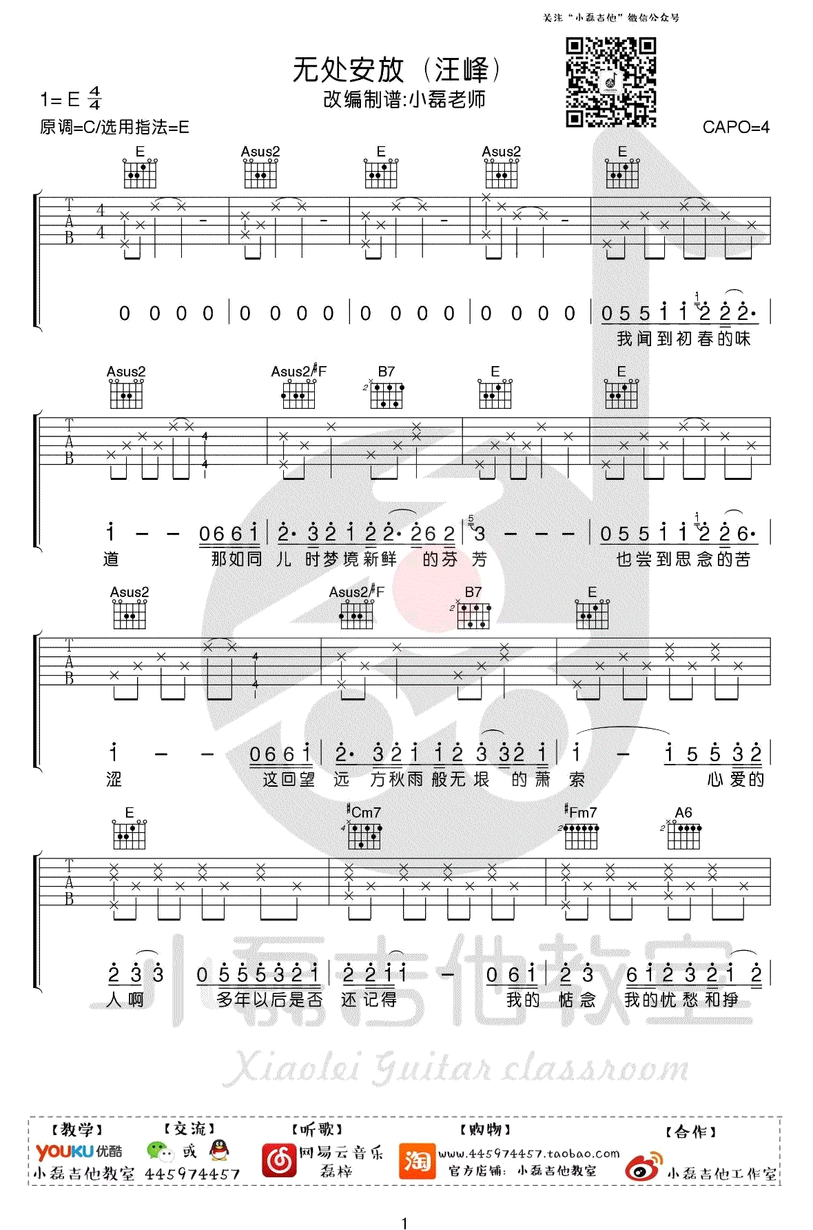 吉他汪峰《无处安放》吉他谱_吉他弹唱谱_王一编配