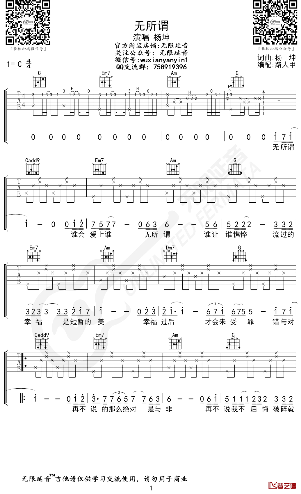 吉他无所谓吉他谱 C调弹唱谱 杨坤 无限延音编配