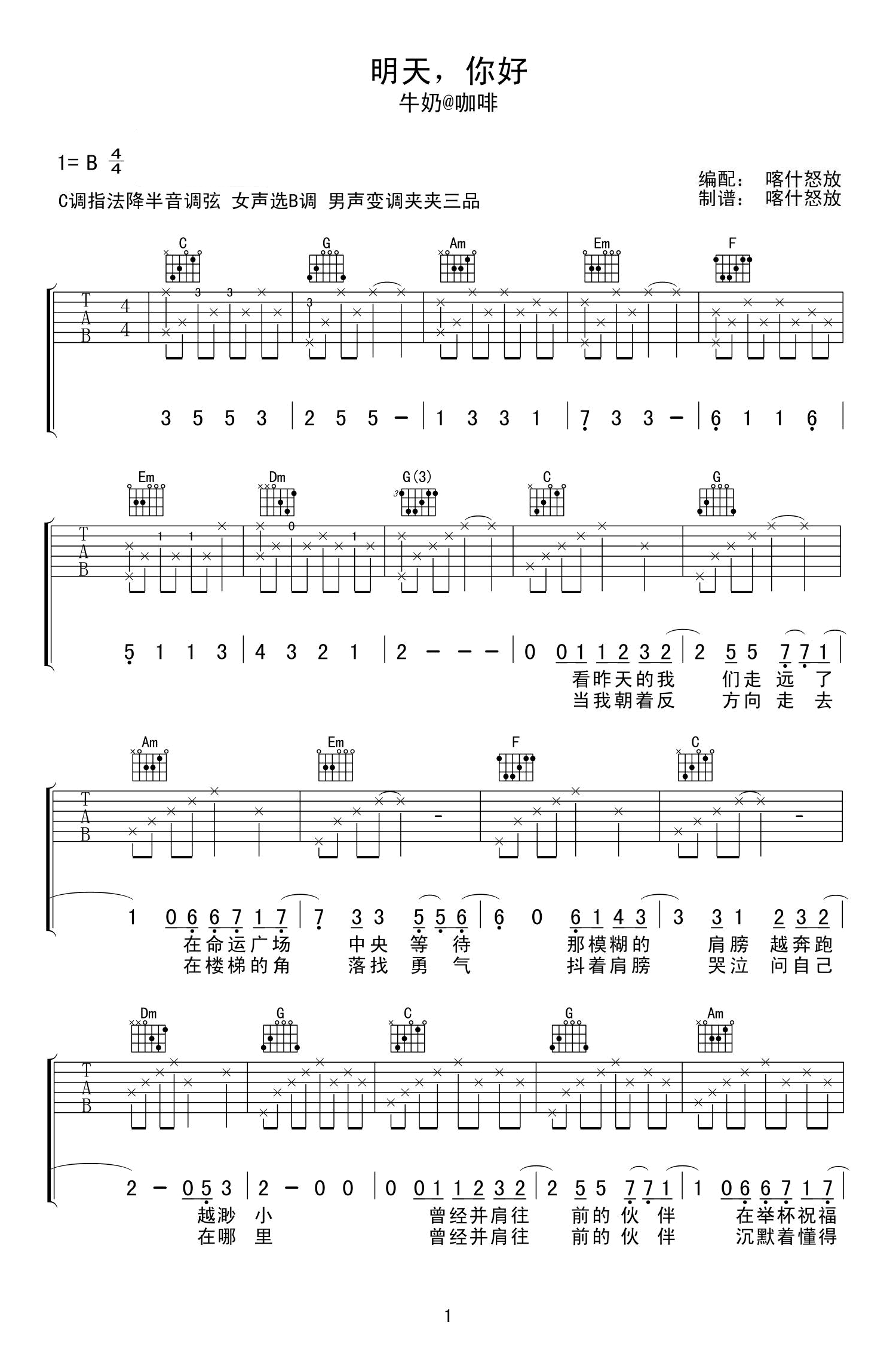 明天你好吉他谱_牛奶咖啡_C调_弹唱六线谱原调B,选用C调指法,女生选B调,男生变调夹夹三品,三张高清图片六线谱。...