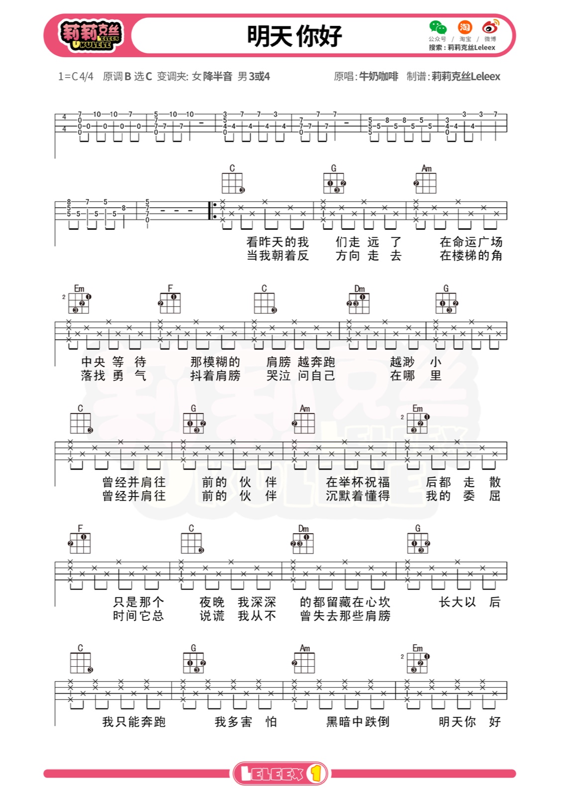 牛奶咖啡《明天你好》尤克里里曲谱C调完整弹唱...