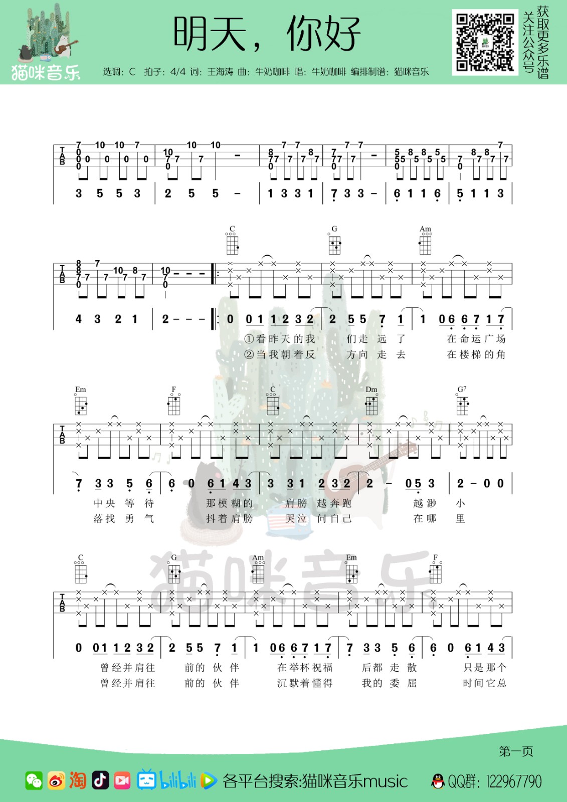 明天你好吉他谱,C调指法,牛奶咖啡演唱的的一首经典代表作品,本曲谱适合初学者,仅适合练手。坚信对的人会在对的时间到来,一切顺其自然,心若向阳,无谓悲伤,告别过去,展望未来,一切都是新开始,明天你好!...