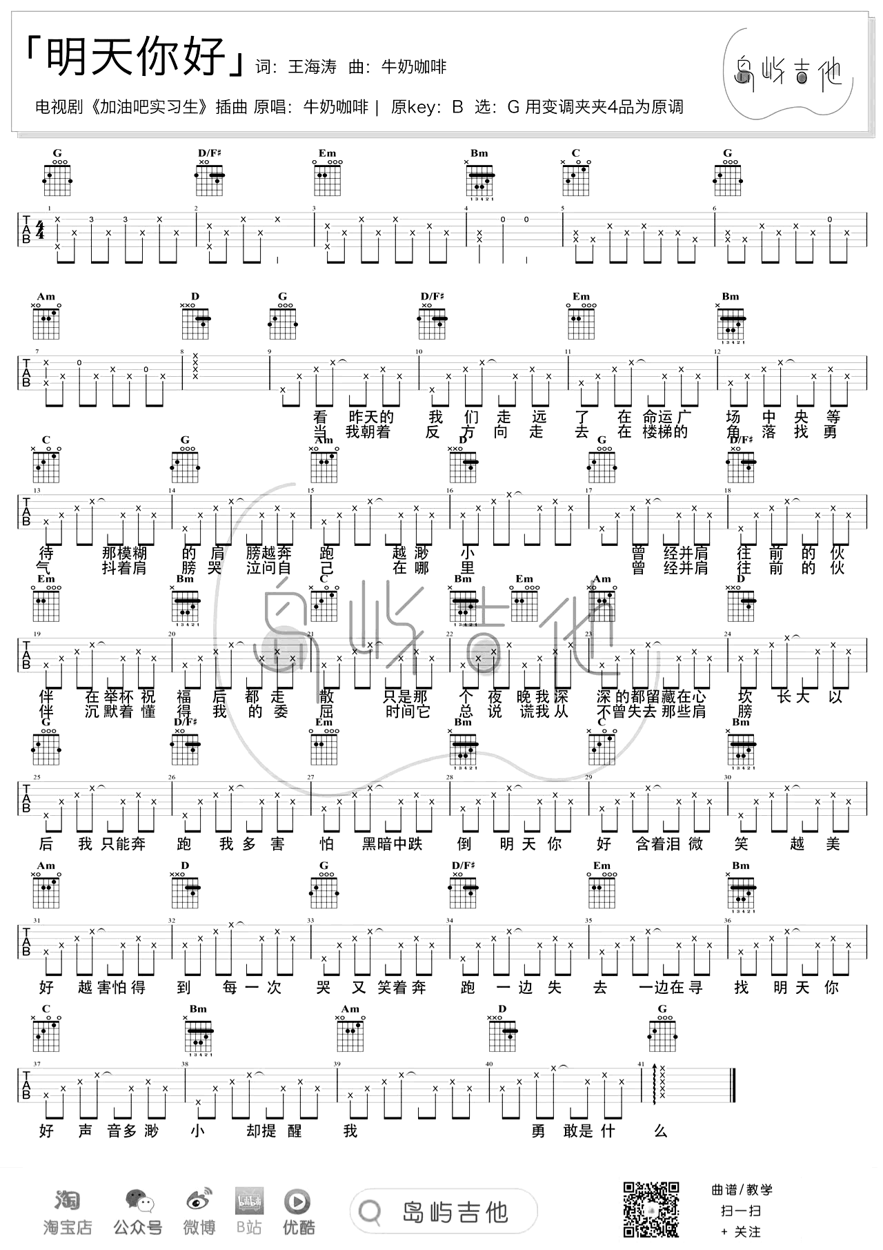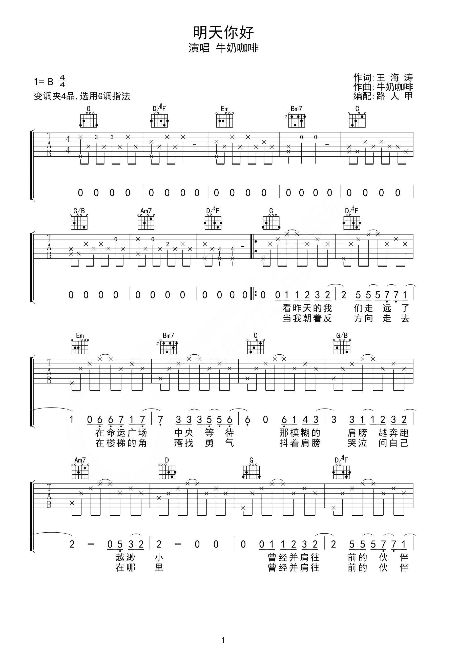 明天你好吉他谱,牛奶咖啡一首经典代表作品,这首歌送给所有毕业生,虽然长大很累,但还是要勇敢努力追梦!《明天你好》吉他弹唱谱,原调B,选用G调指法,变调夹夹四品为原调音高,图片谱共两张谱例,分别为六线谱+和弦谱各一张。感谢岛屿吉他出品分享,并带来吉他弹唱教学视频,酷玩吉他上传更新。...