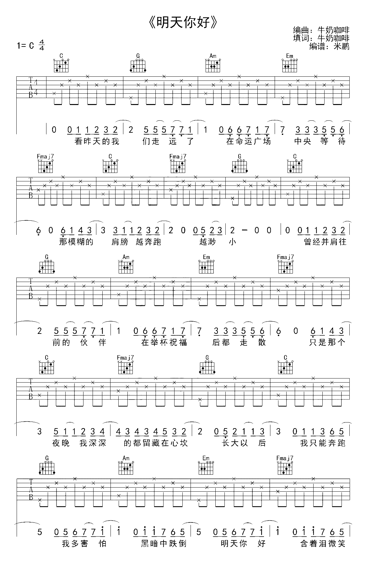 吉他牛奶咖啡《明天你好》吉他谱_吉他弹唱谱_米鹏编配