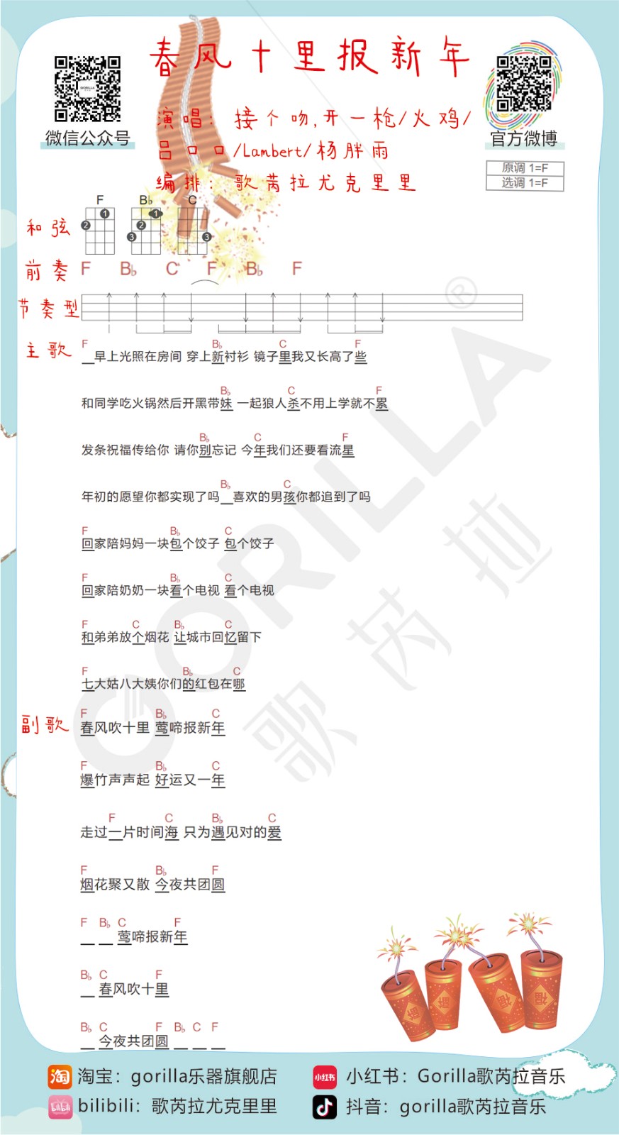 《春风十里报新年》尤克里里谱,共有1张高清图谱,免翻页排版设计。...
