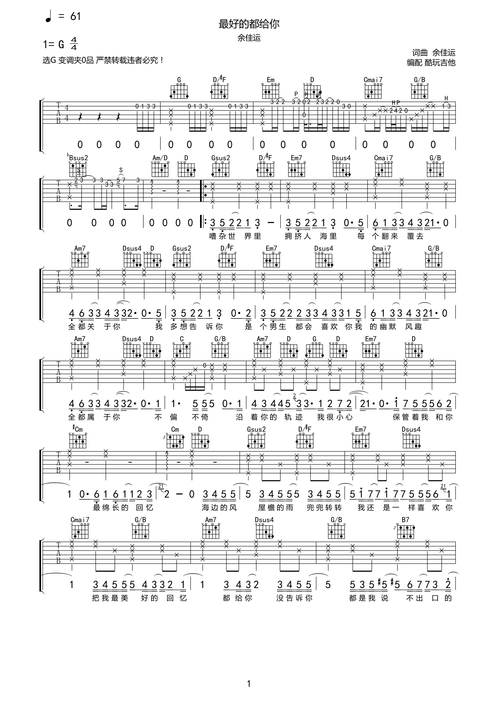 吉他最好的都给你吉他谱_余佳运_G调弹唱谱