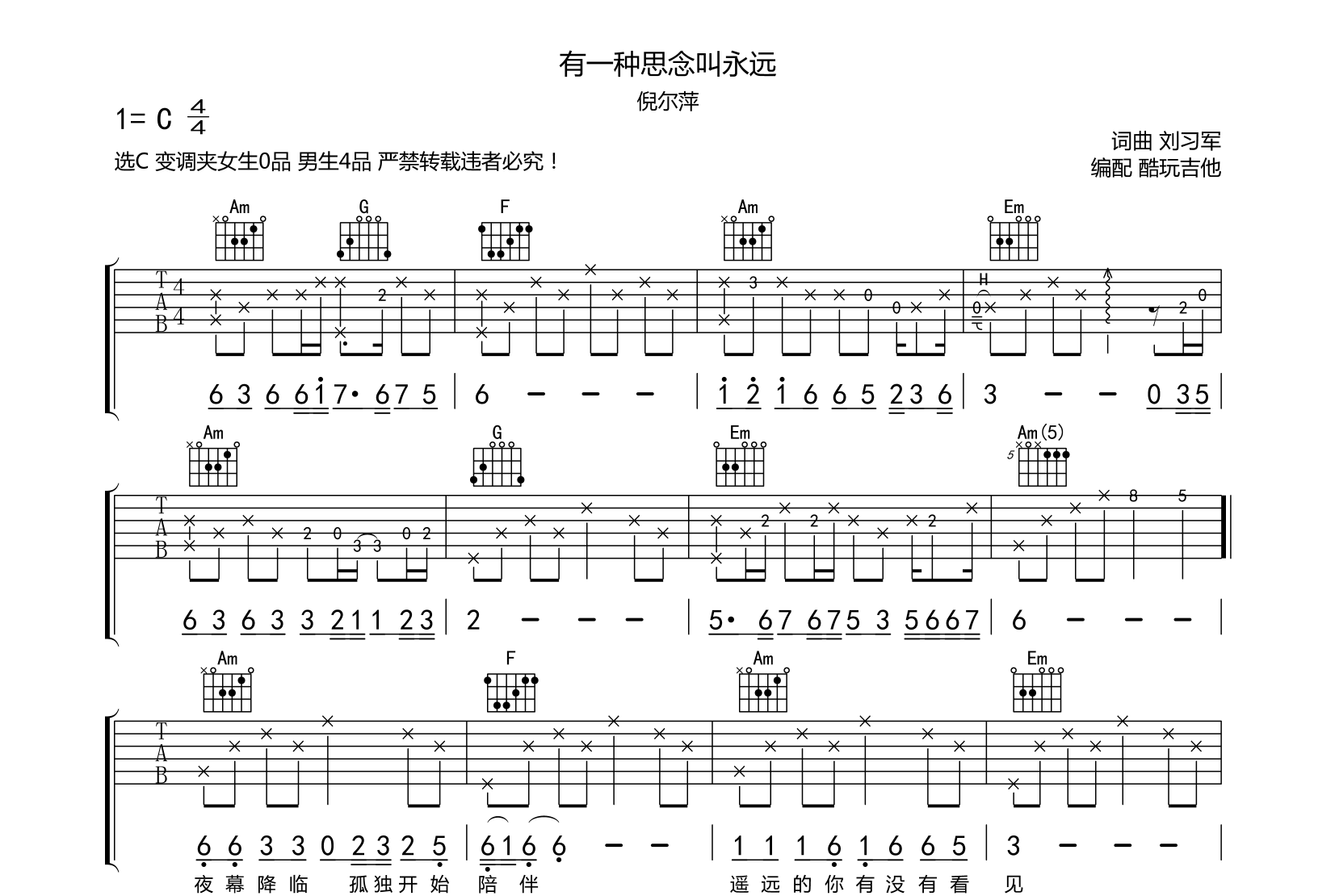 有一种思念叫永远吉他谱-倪尔萍、刘习军女生版变调夹0品男生版变调夹4品歌曲比较简单音频不再示范...