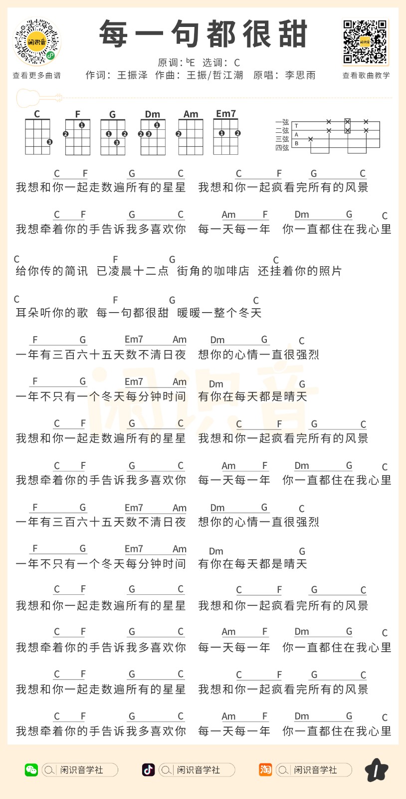 李思雨《每一句都很甜》尤克里里曲谱-C调弹唱谱...