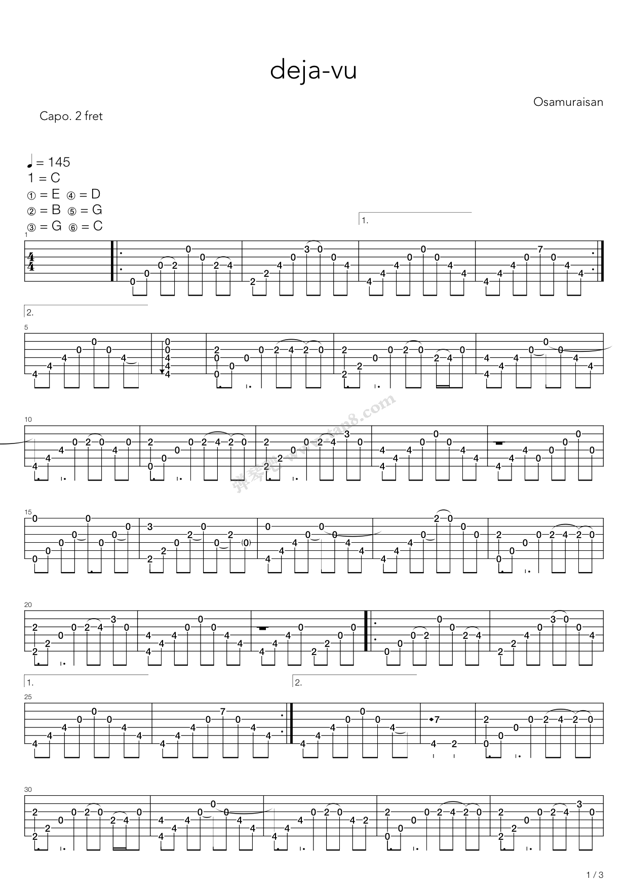 吉他武士桑《既视感》吉他谱指弹谱 C调简单版