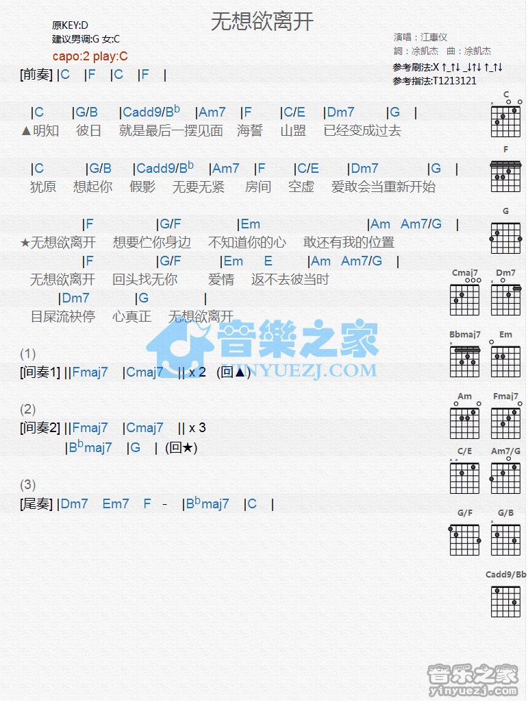 C调版江惠仪《无想欲离开》吉他和弦弹唱谱...