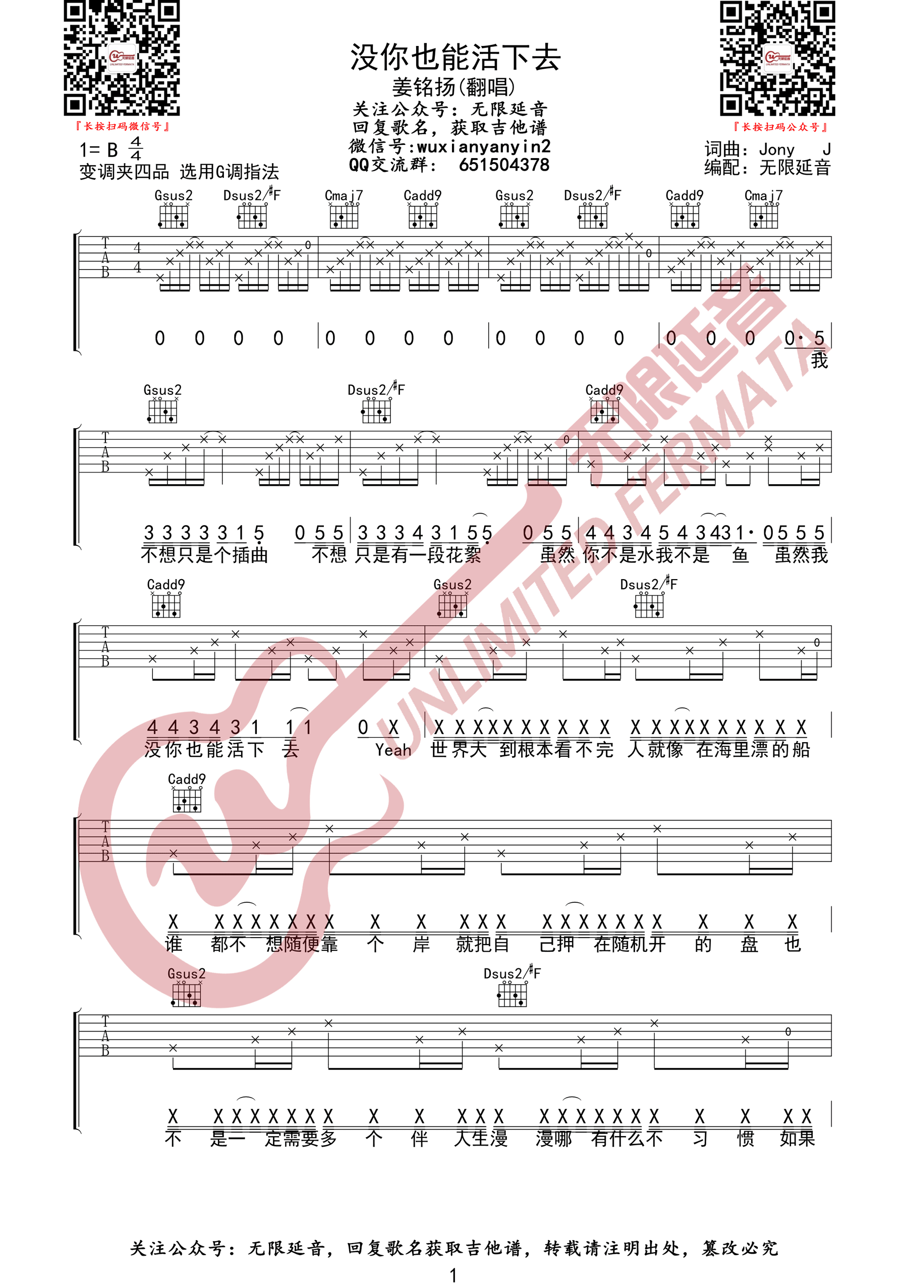 《没你也能活下去》吉他谱_姜铭杨_G调弹唱六线谱...
