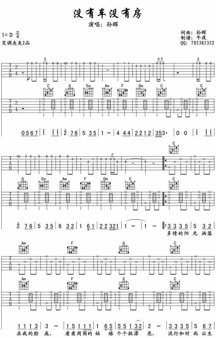 《没有车没有房》吉他谱_孙辉_D调原版弹唱谱...