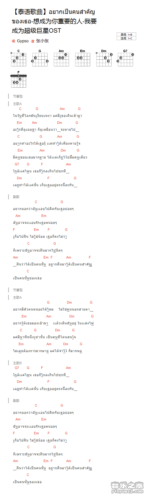 吉他泰语歌曲《想成为你重要的人》吉他谱_吉他弹唱谱_YYZJ编配