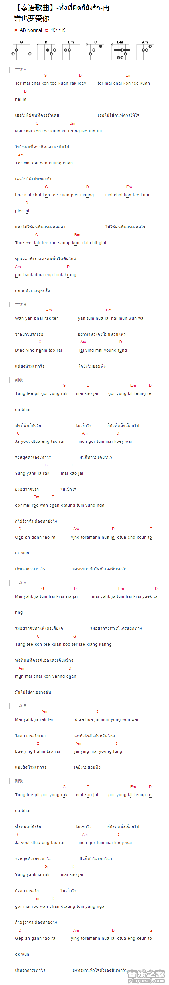 吉他泰语歌曲《再错也要爱你》吉他谱_吉他弹唱谱_YYZJ编配