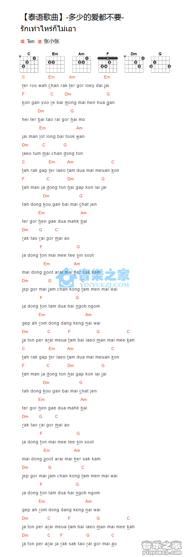 泰语歌曲《多少的爱都不要》吉他和弦弹唱谱...
