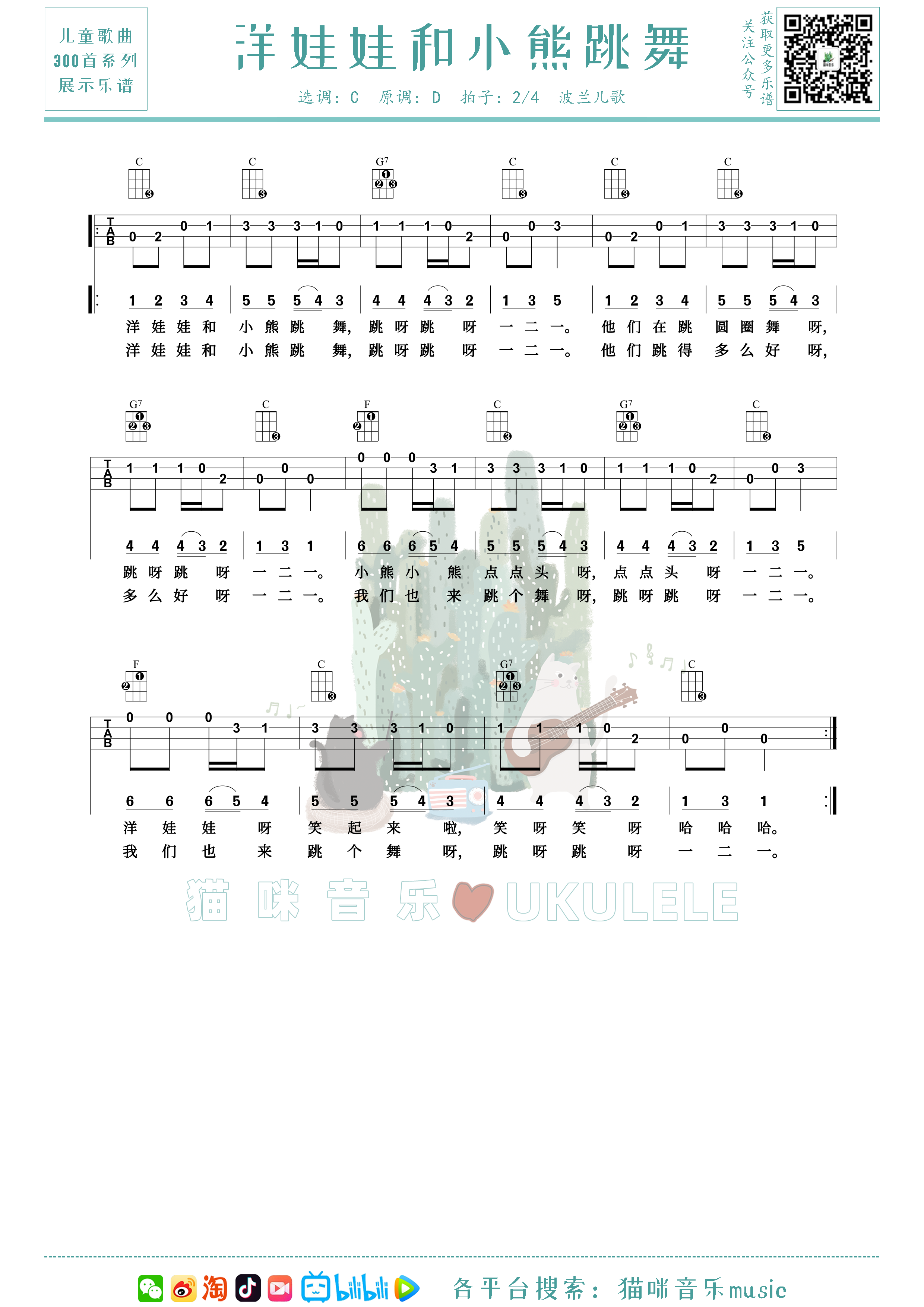 尤克里里《洋娃娃和小熊跳舞》尤克里里儿童歌曲300首系列,弹唱指弹双谱合一版。