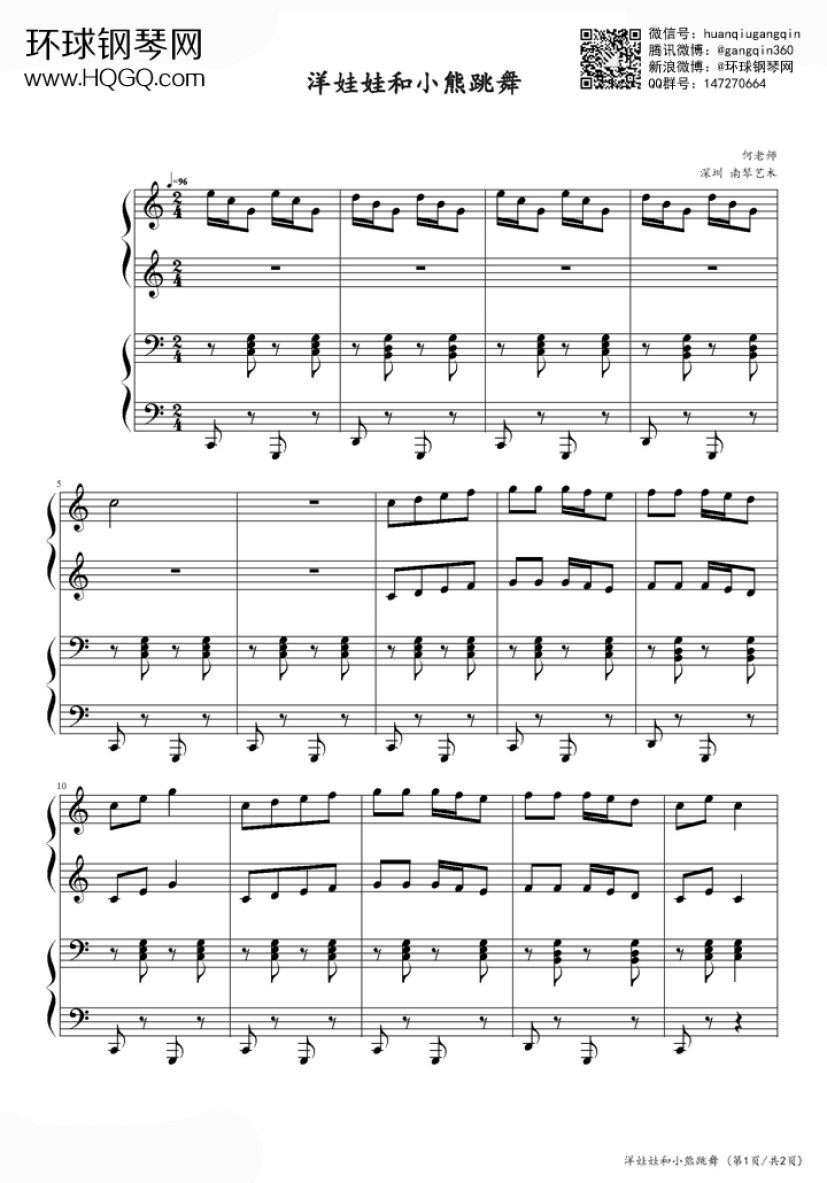 钢琴《洋娃娃和小熊跳舞》钢琴谱(最完美简单四手连弹)