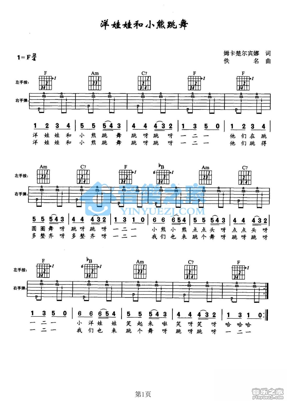 F调版儿歌《洋娃娃和小熊跳舞》吉他弹唱六线谱...
